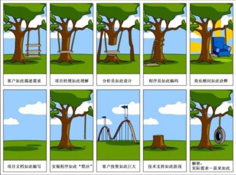 分析員:這個無知的(de)項目經理(lǐ),兩個樹枝上挂上秋千哪還能蕩漾起來嗎?除非是把樹從中截斷再支起來,這樣就滿足要求了。